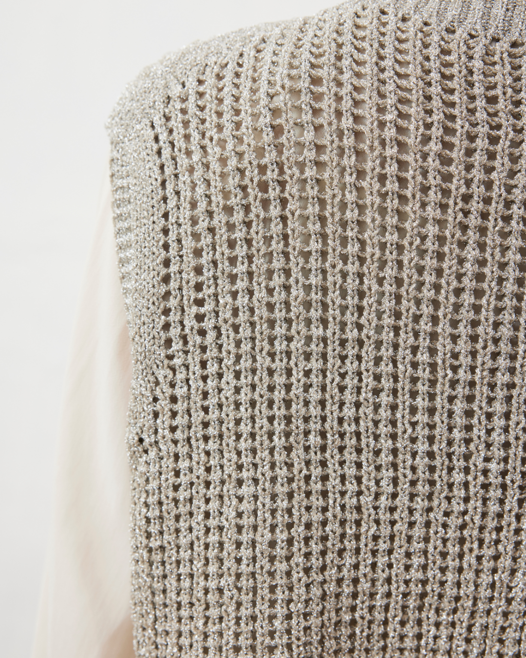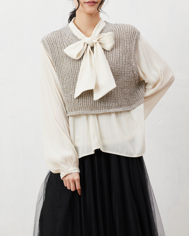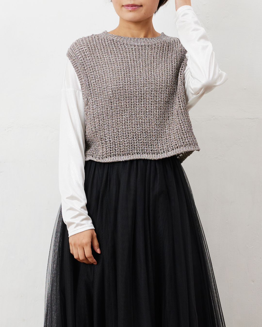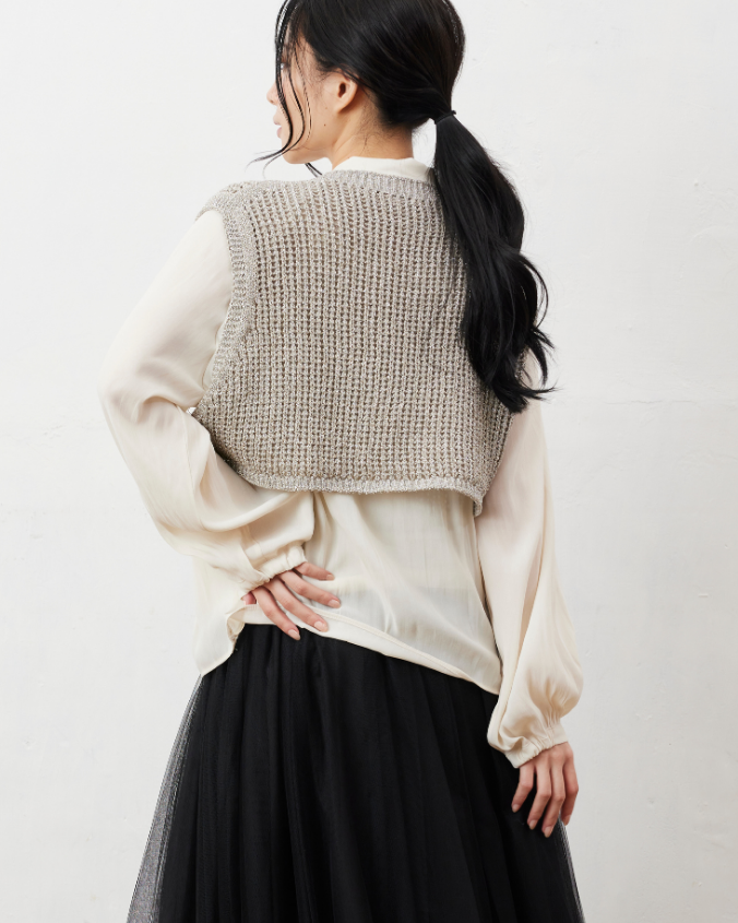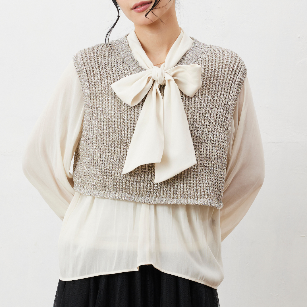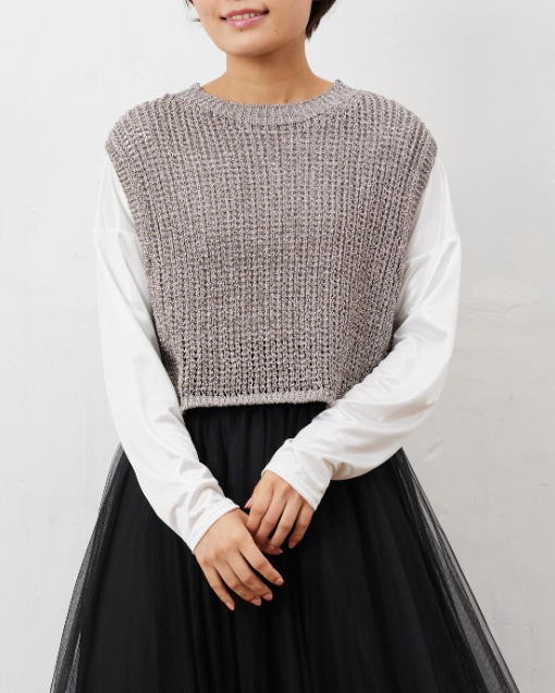さりげなく輝くラメが、シンプルなコーディネートに華やかさをプラスし、トレンド感を高めてくれるベスト。