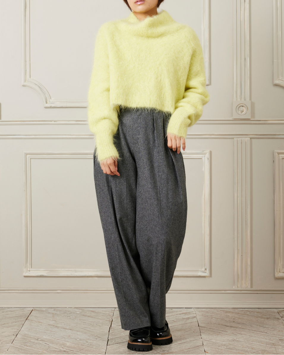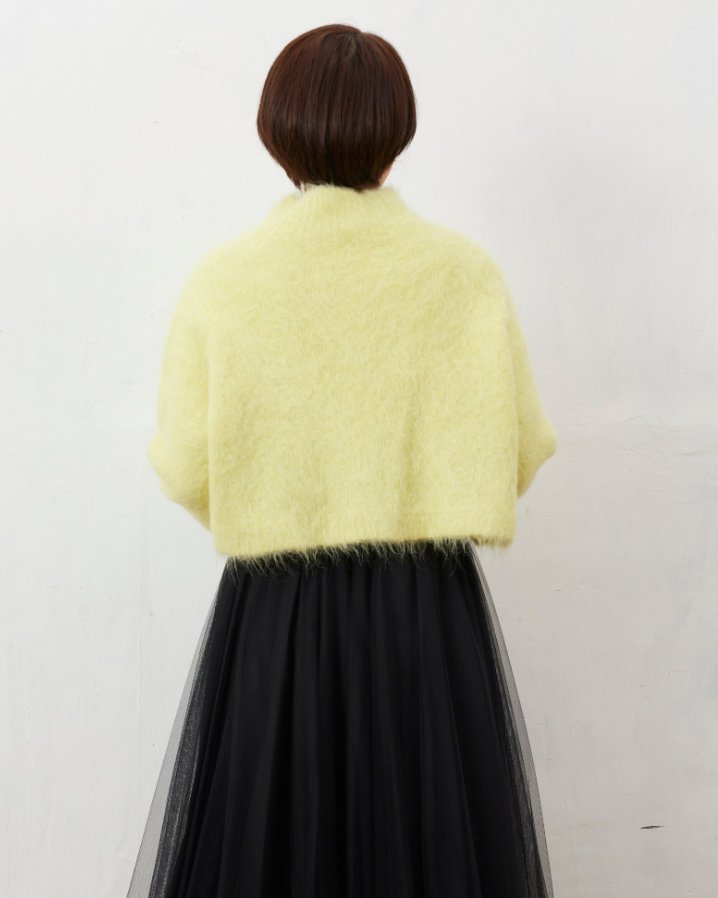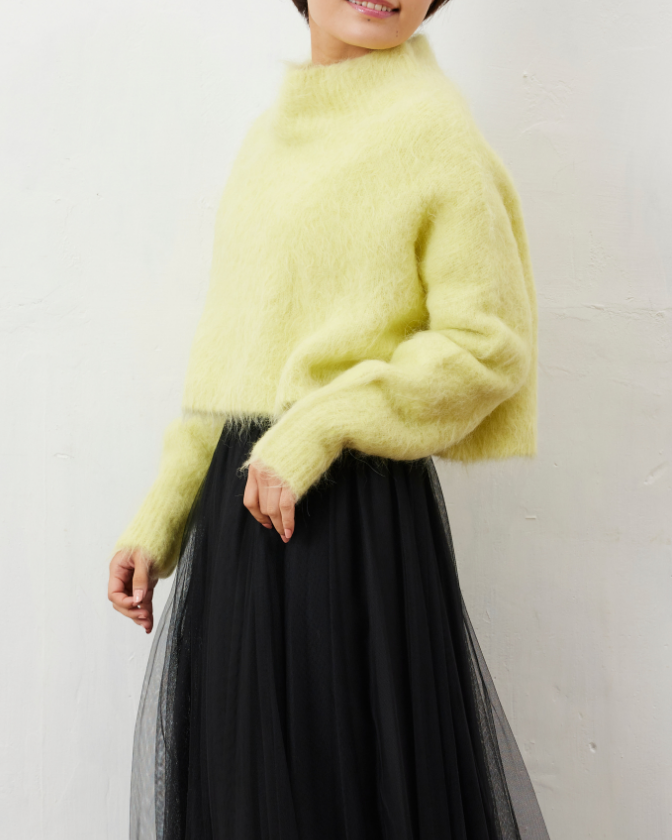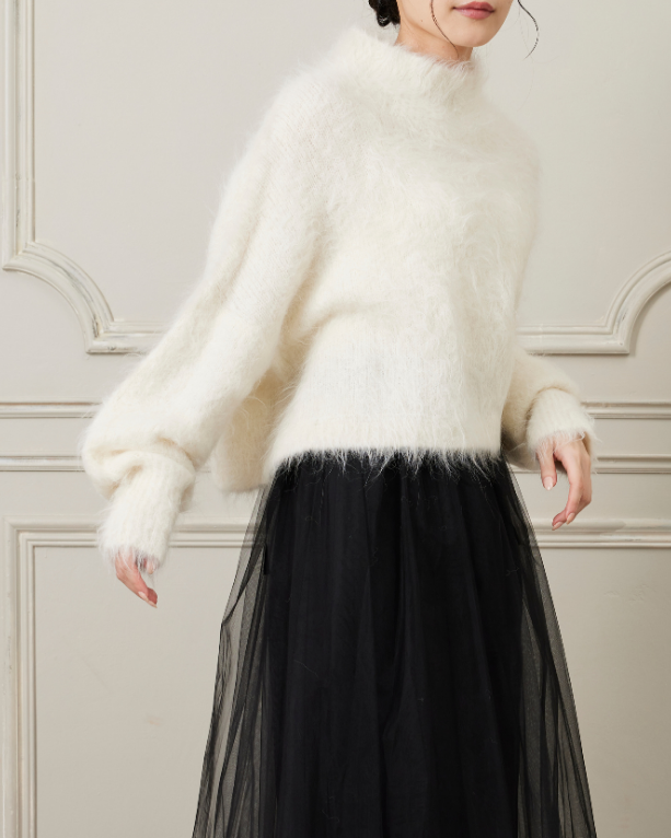 毛足がながめでフワフワとした見た目が可愛いショートニット。