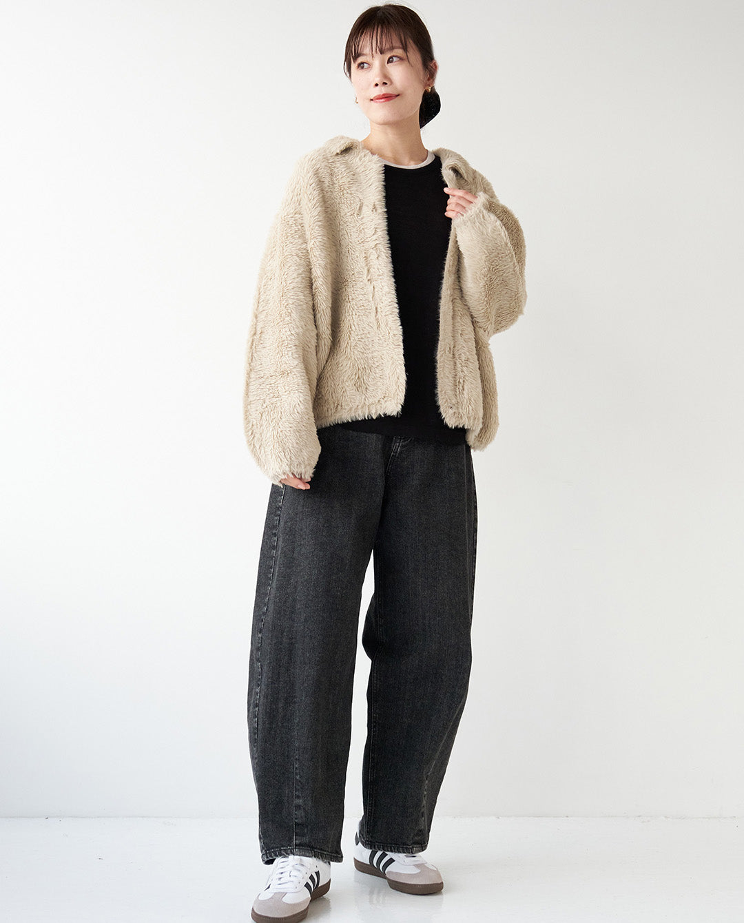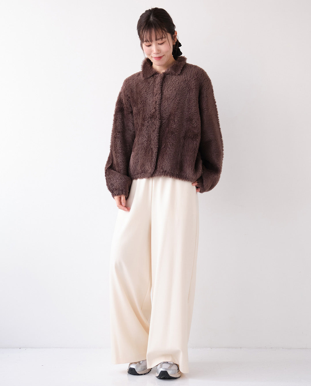 タートルニット+ワイドパンツに羽織れば、きちんと感のある上品なカジュアルに。