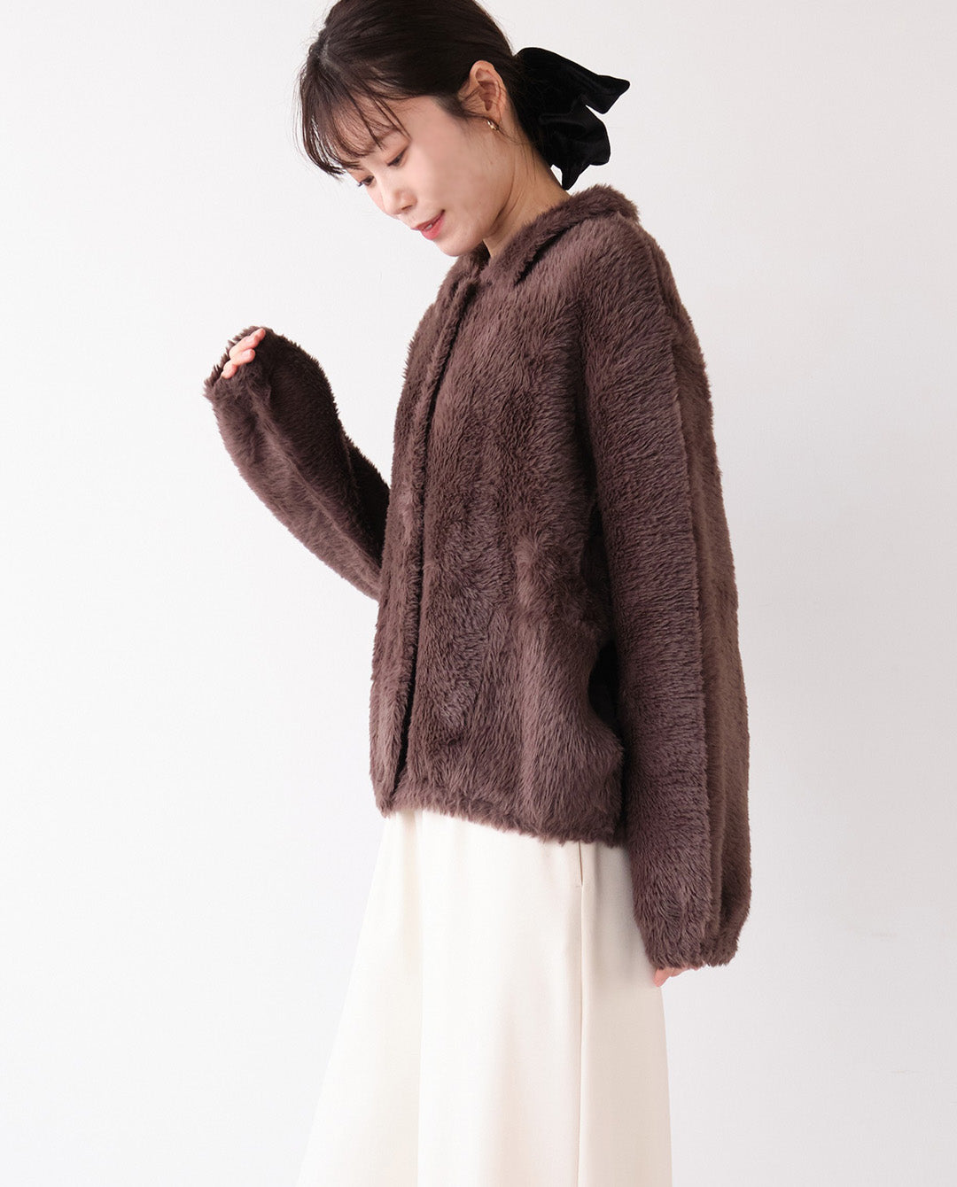 フレアスカートと合わせて、ふんわりシルエットを活かしたエレガントな印象に。