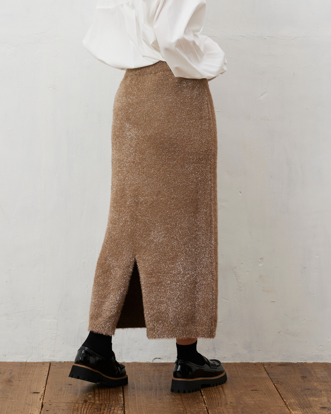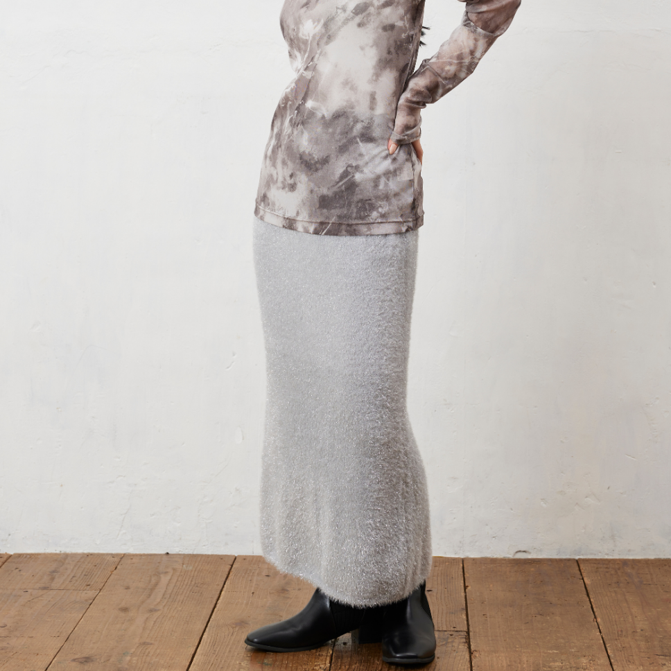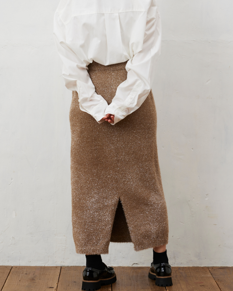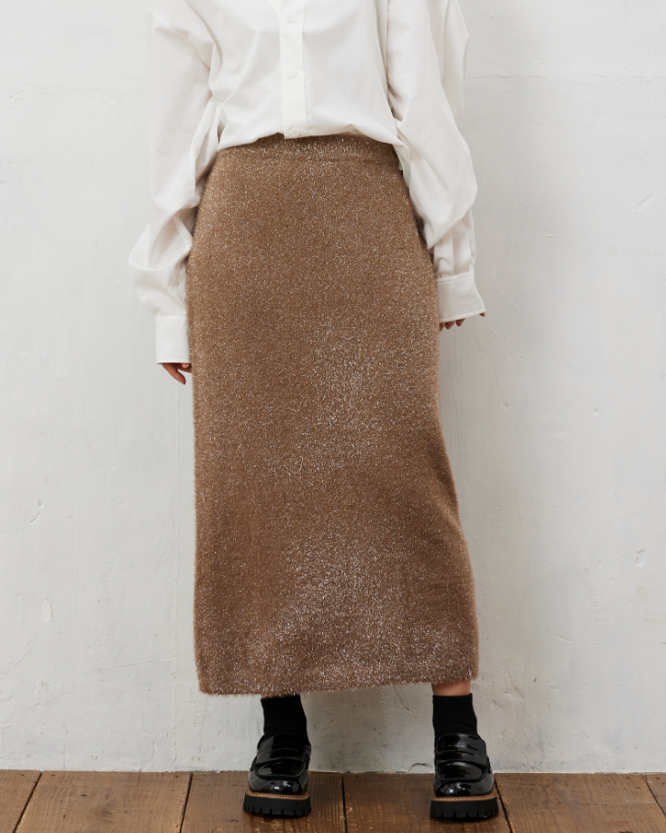 シャギーニット素材にラメが織り込まれた、エレガントさとカジュアルさが絶妙にミックスされたアイテム。