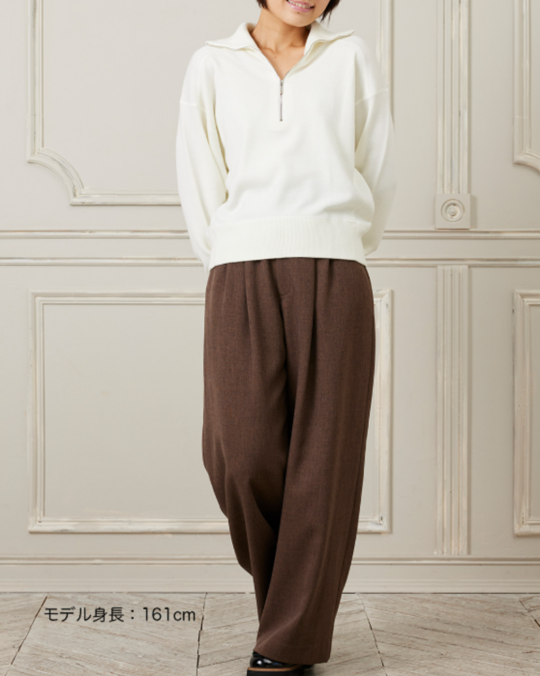 ウエスト部分のリブがすっきりと見せてくれるので、ボリュームのあるAラインスカートやワイドパンツがおすすめ。