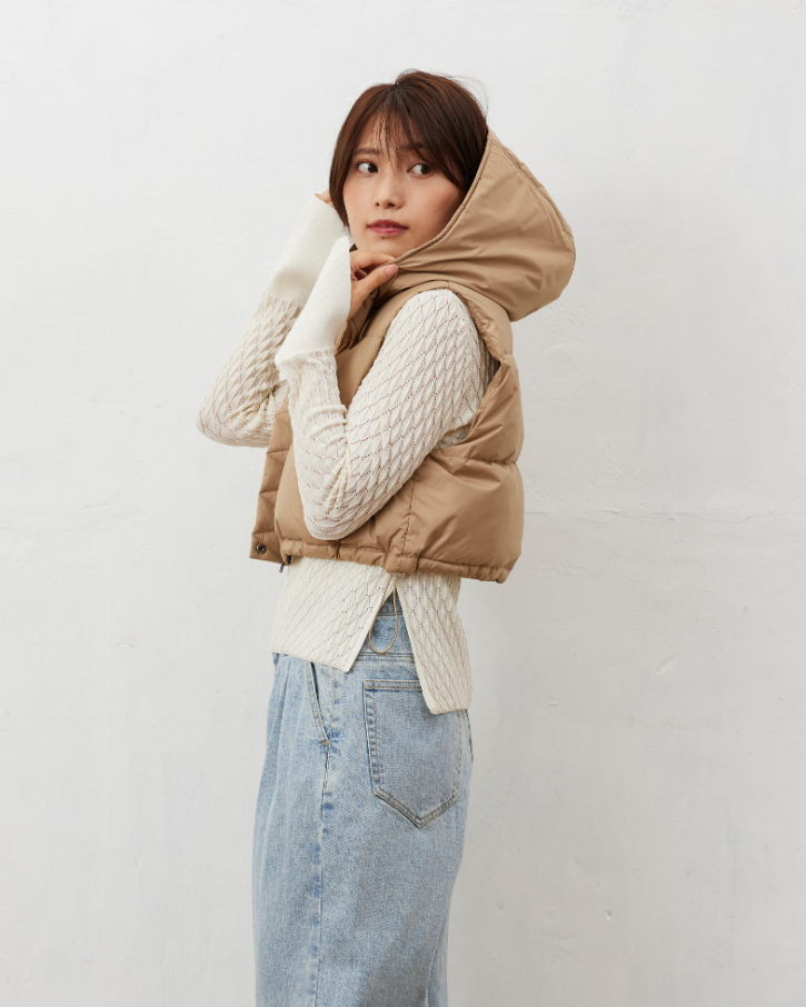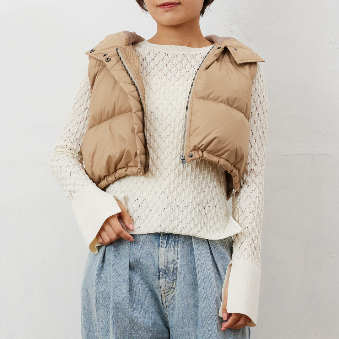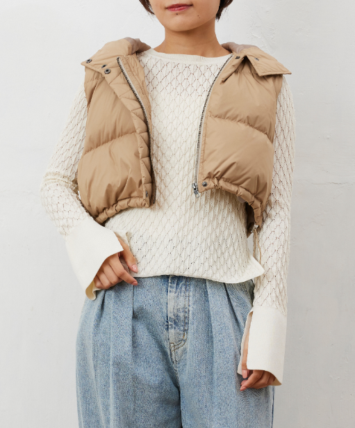 コンパクトデザインのショート丈ダウンベスト。ボリュームを抑えた程よいふっくらシルエットが、デイリー使いしやすいアイテムです。