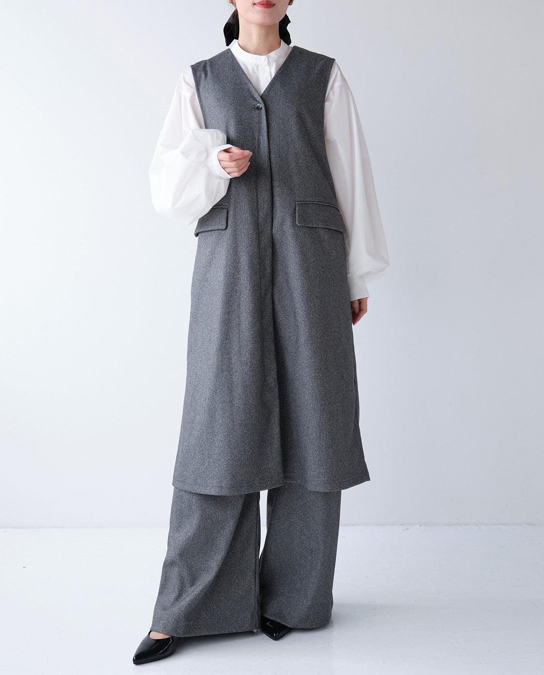 同素材のVネックロングジレとセットアップ風に合わせるのもおすすめです。