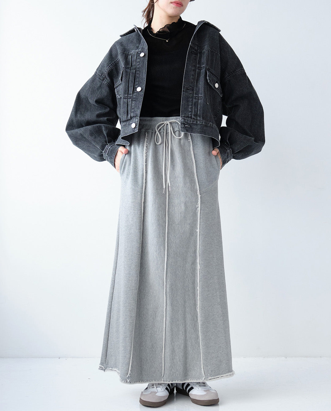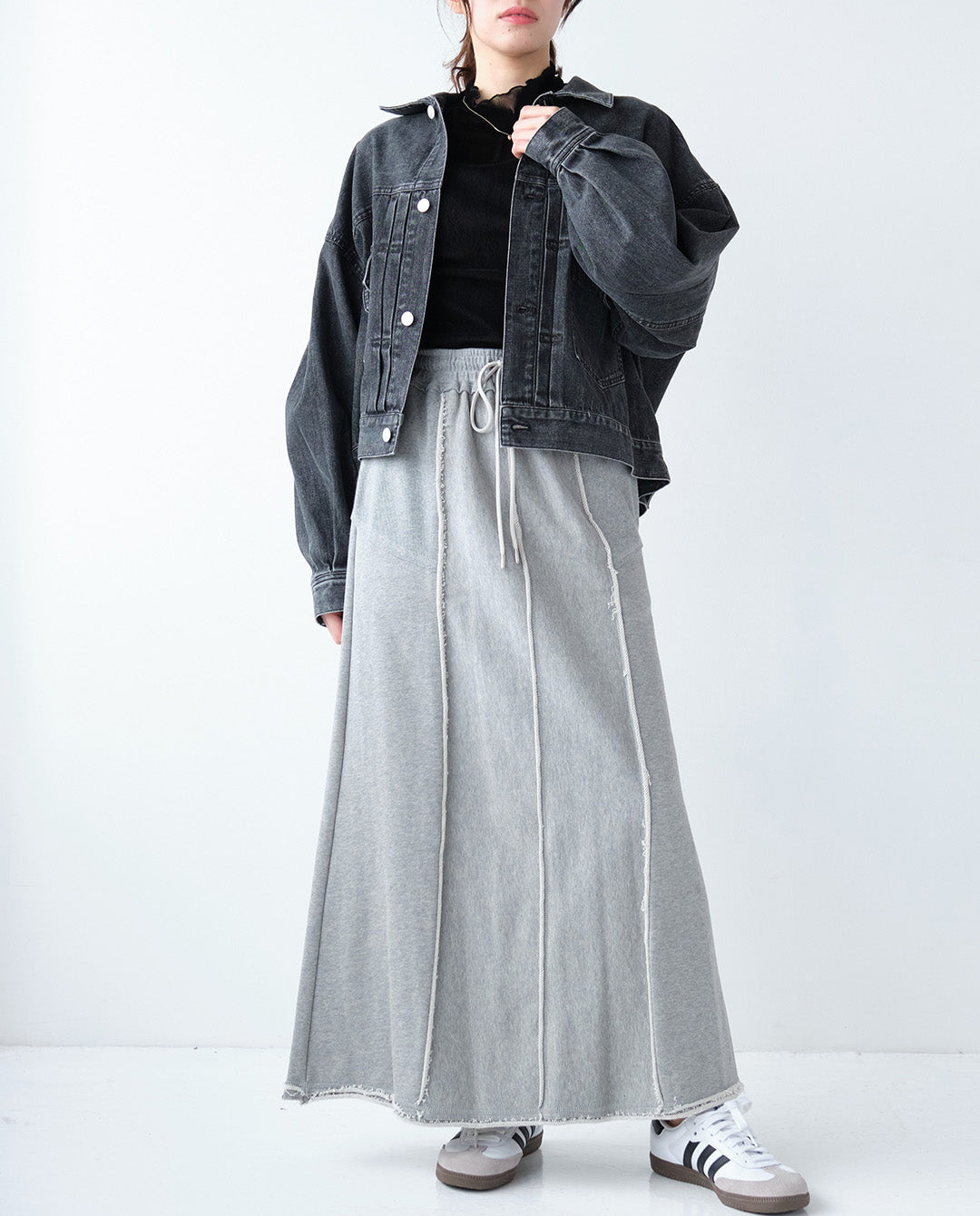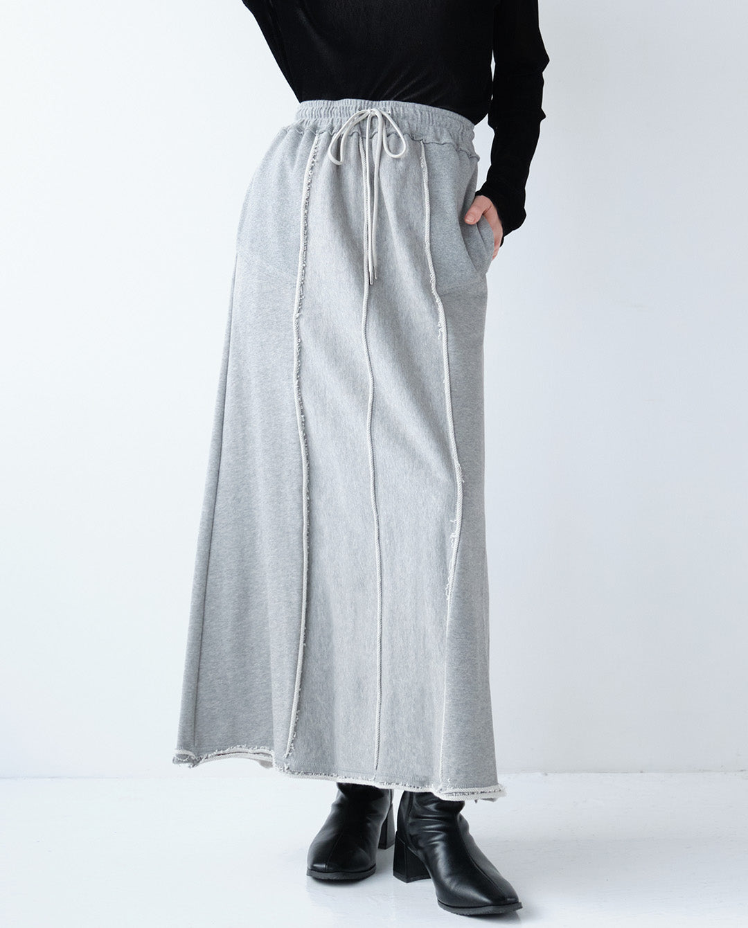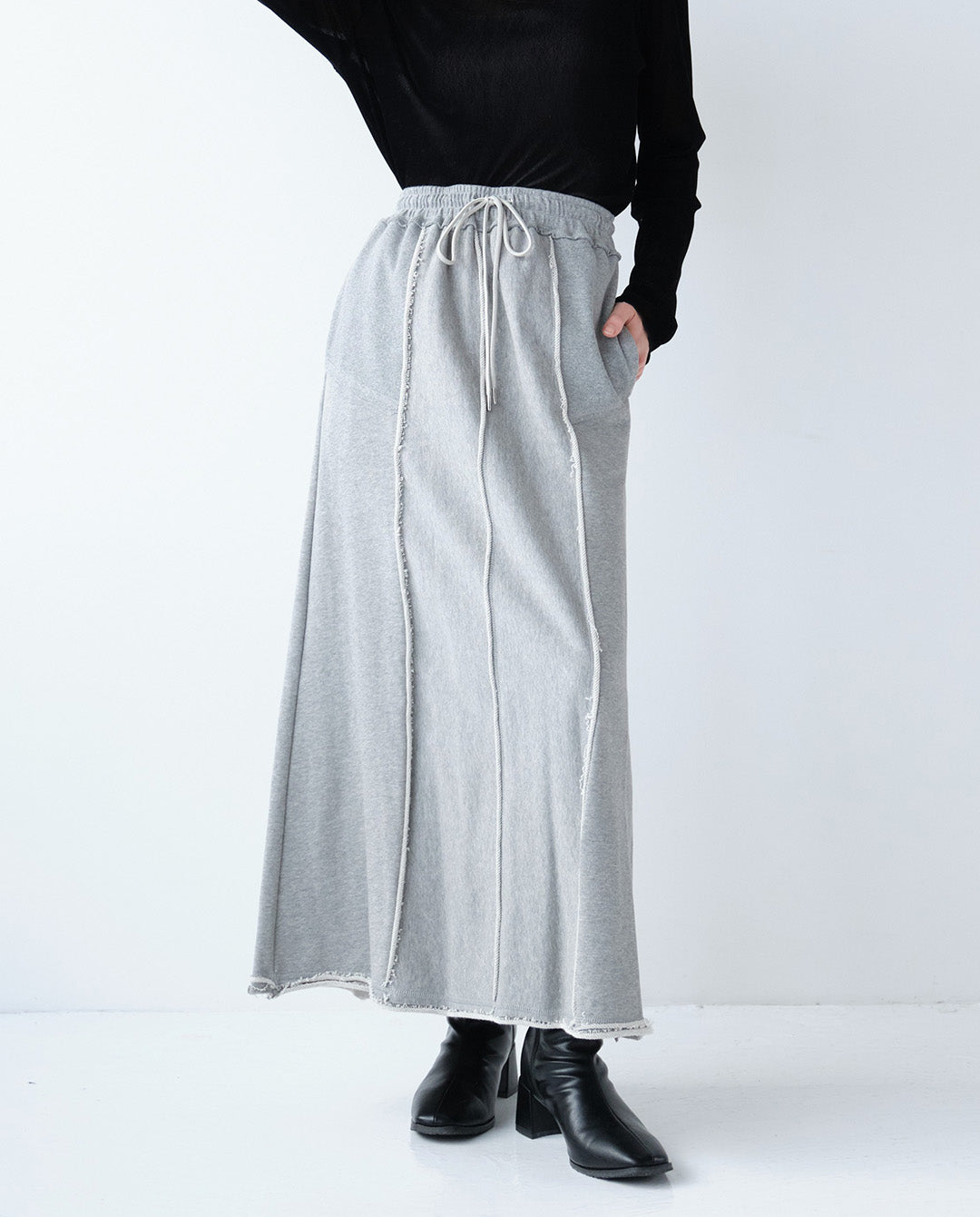 切りっぱなしのカットオフデザインがポイントのジャージー素材スカート。