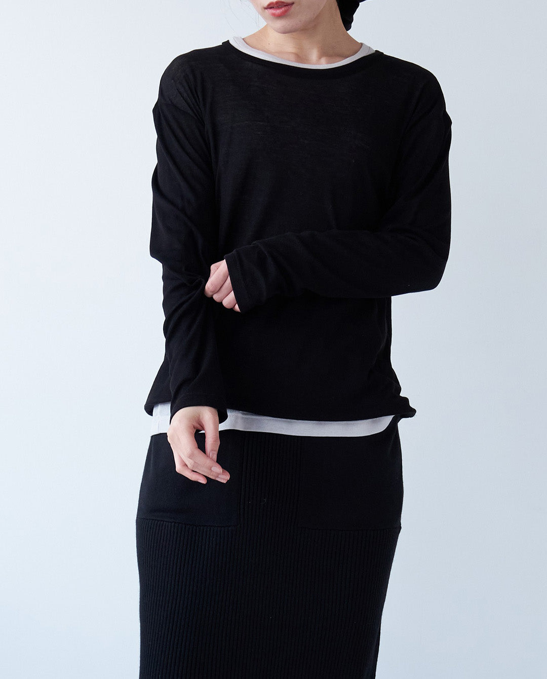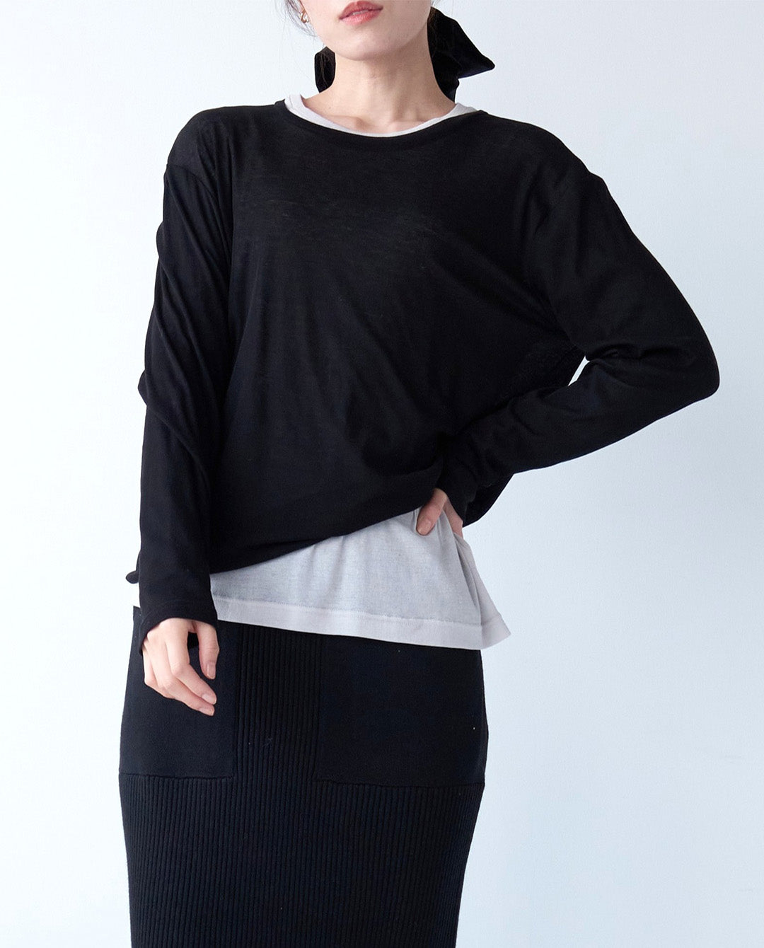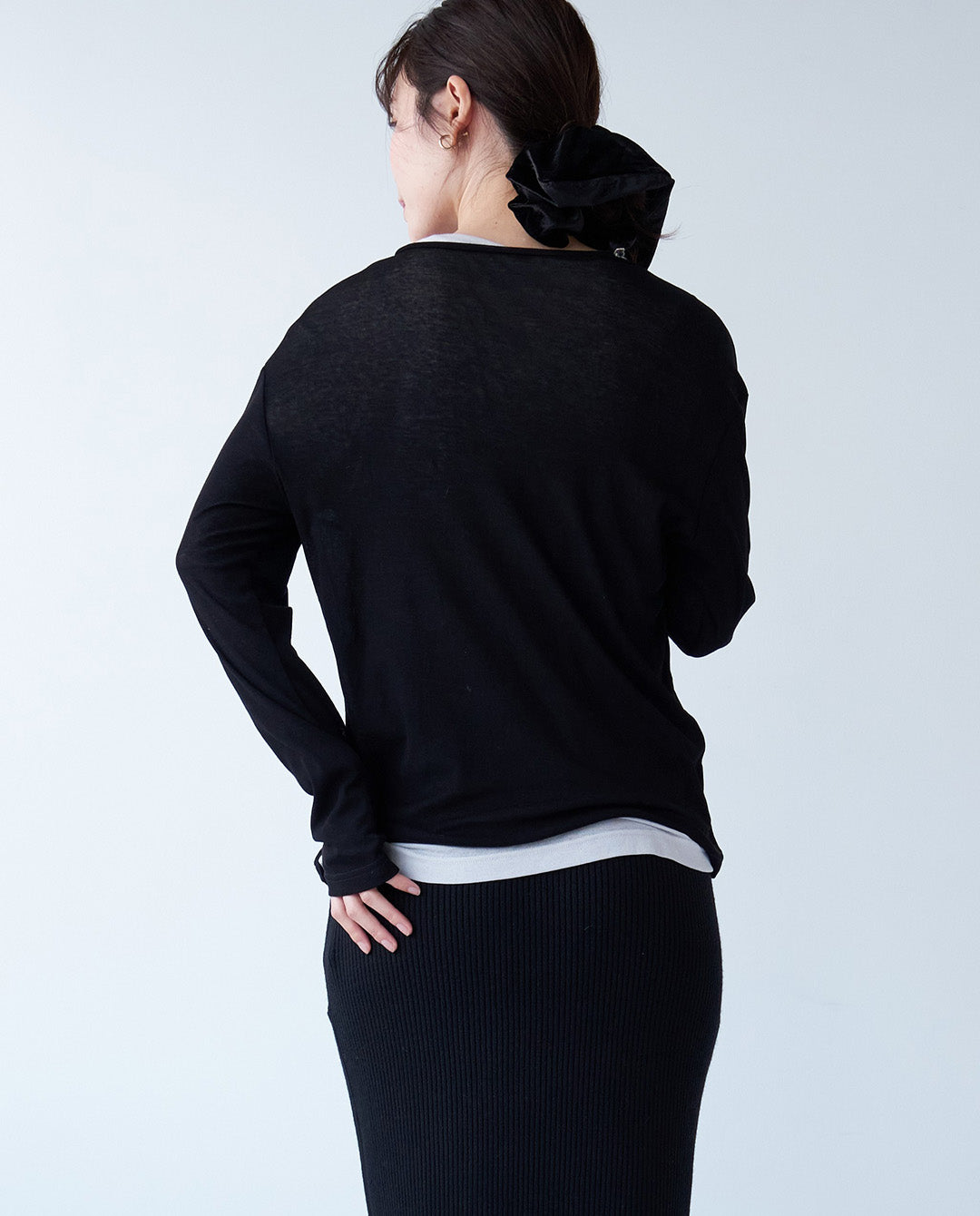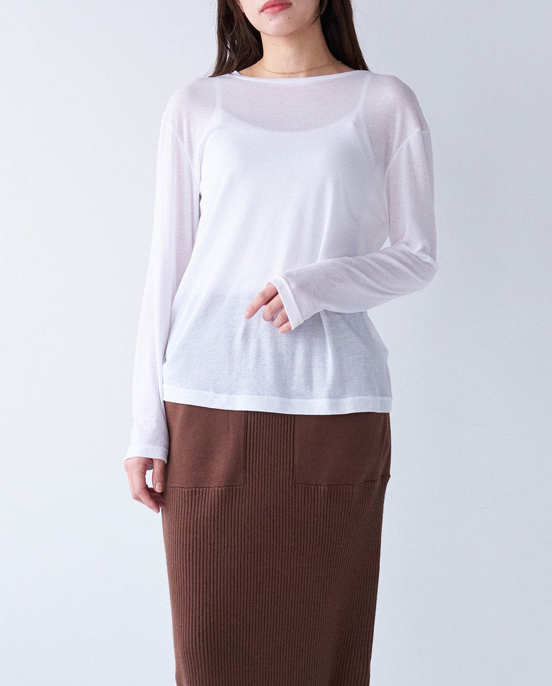 絶妙な空き具合のネックラインとほどよい透け感で、カジュアルにもきれいめにも合わせやすいアイテムです。