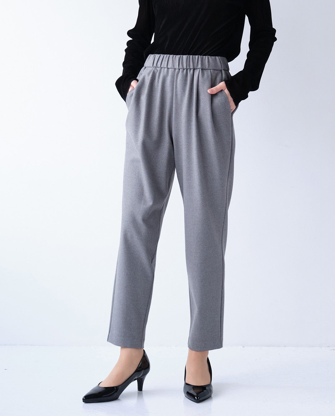 表裏ともに起毛を施した、やわらかく暖かな素材感が魅力のタックテーパードパンツ。