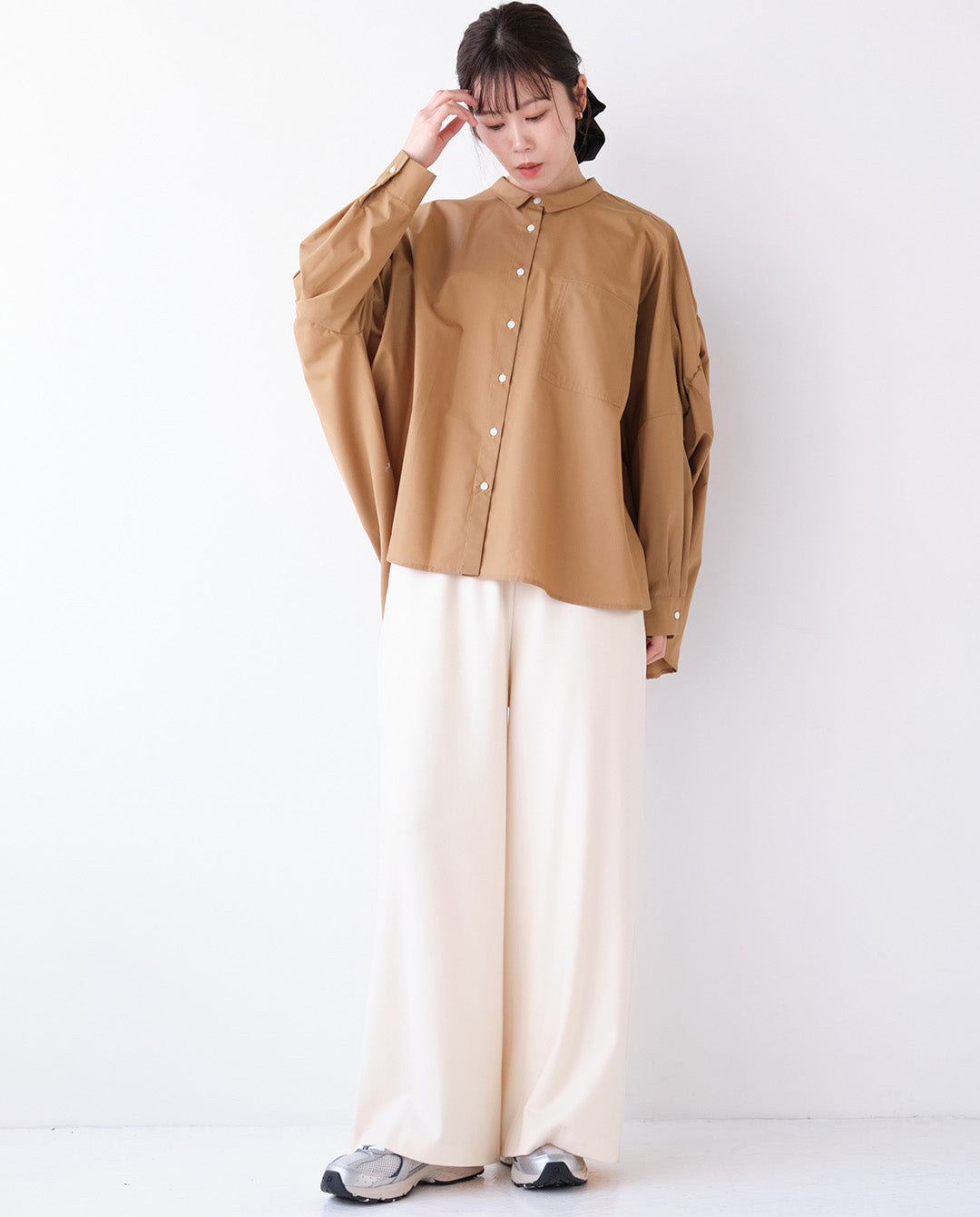 ゆったりとしたワイドシルエットが体を締め付けず、リラックスした着心地です。