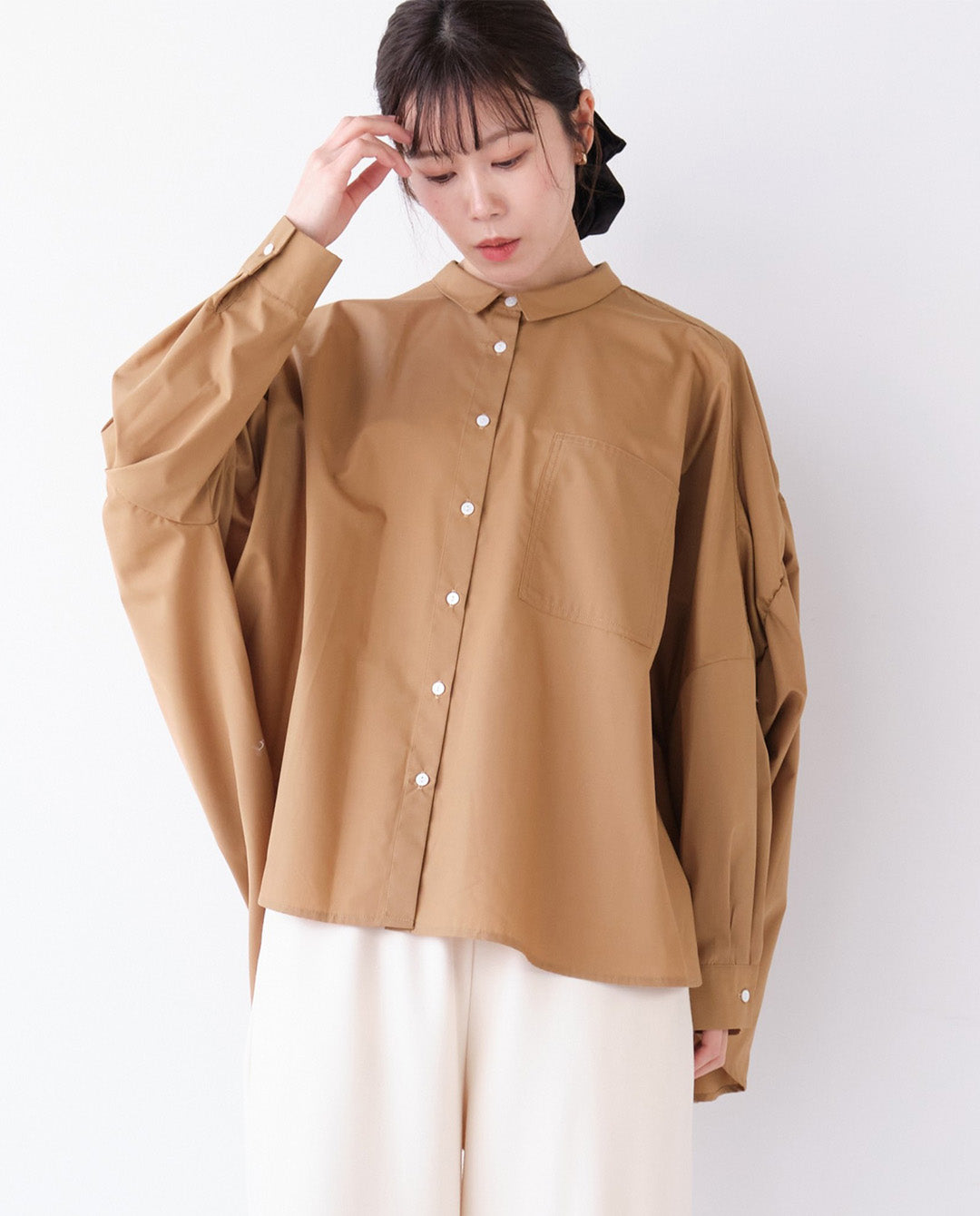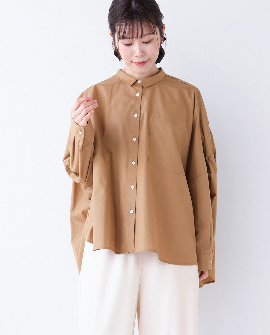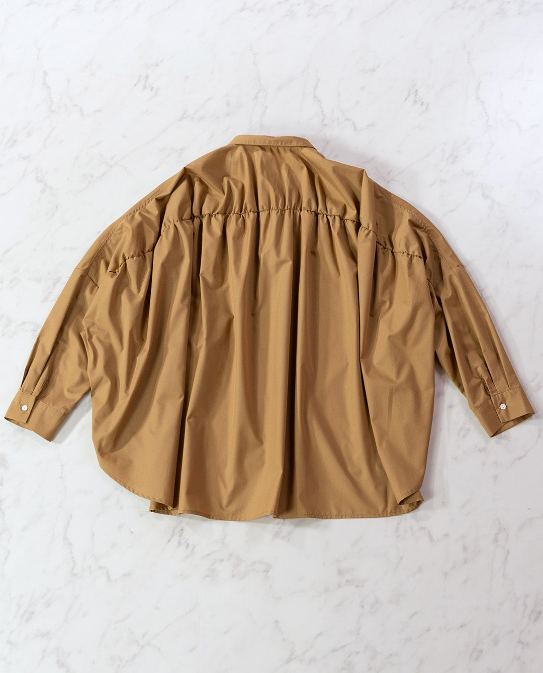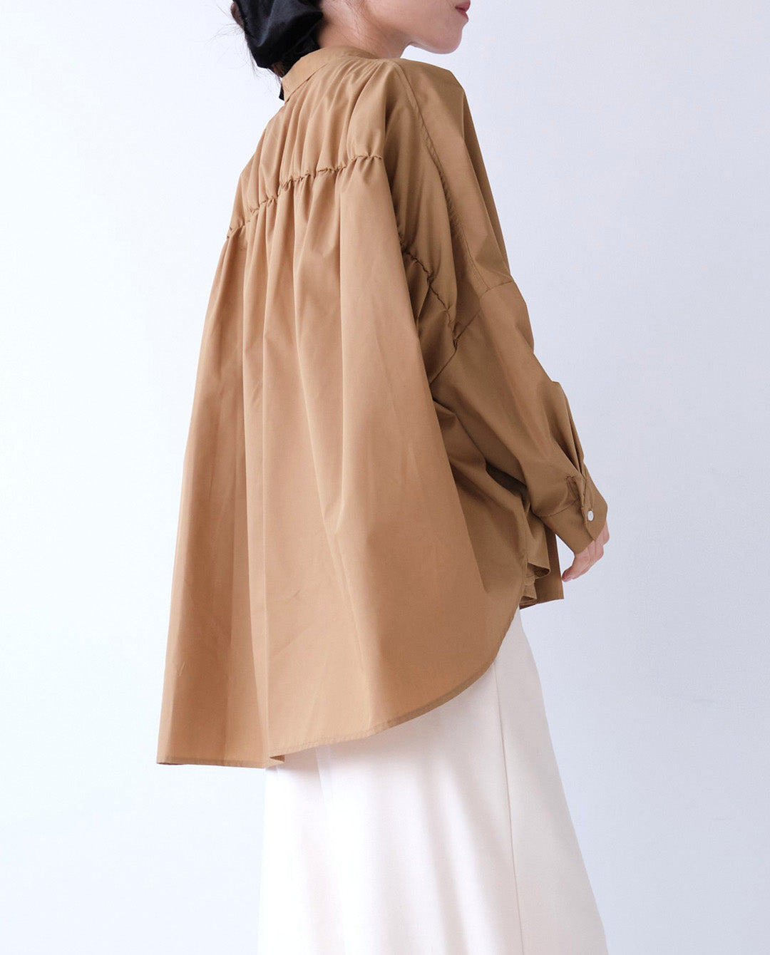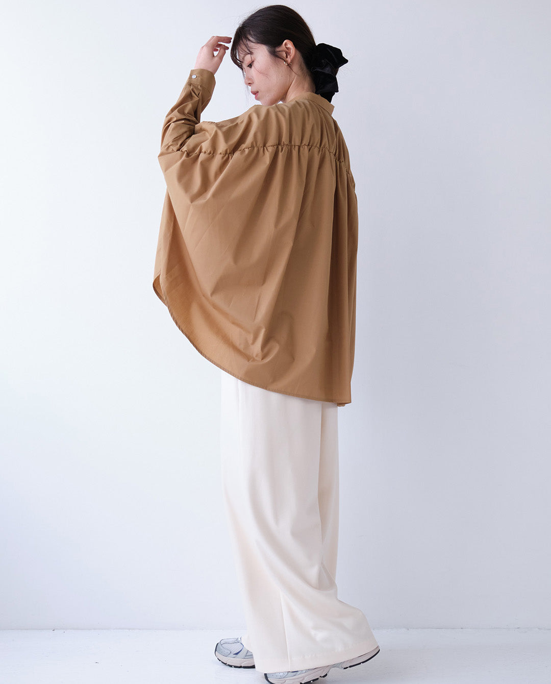 たっぷりとしたワイドめな身幅と、背中のギャザーがポイントのロングスリーブシャツ。