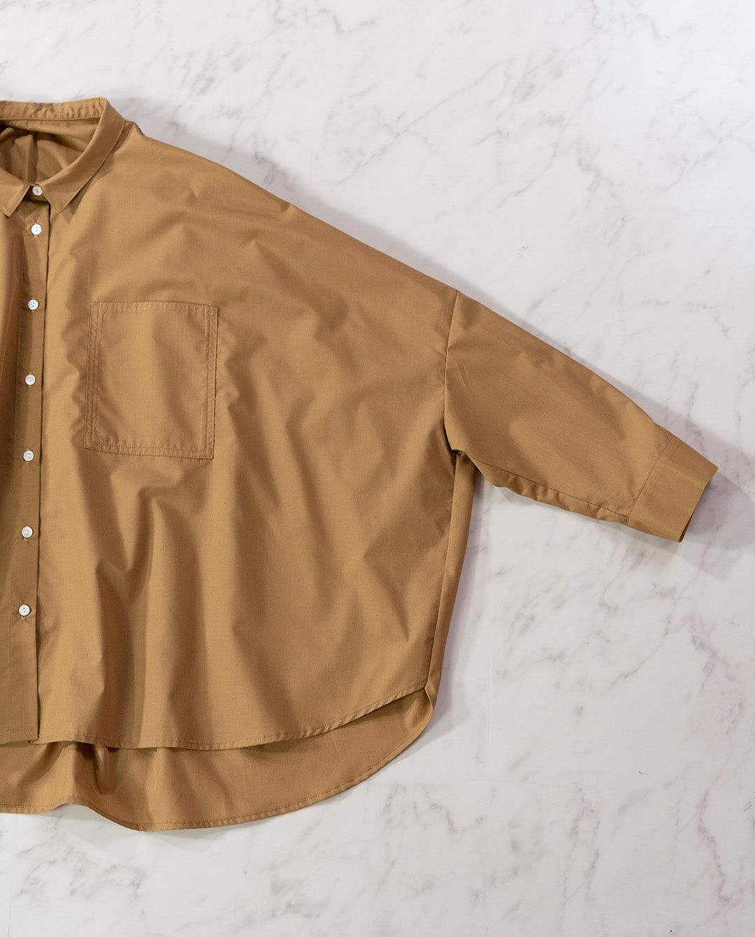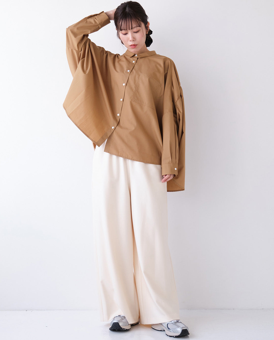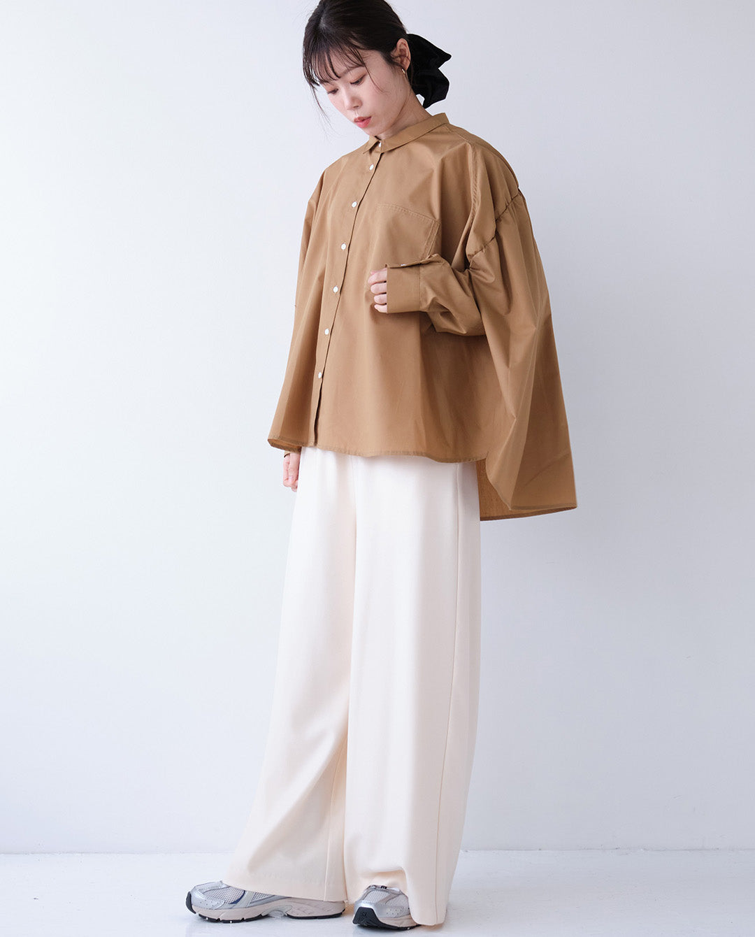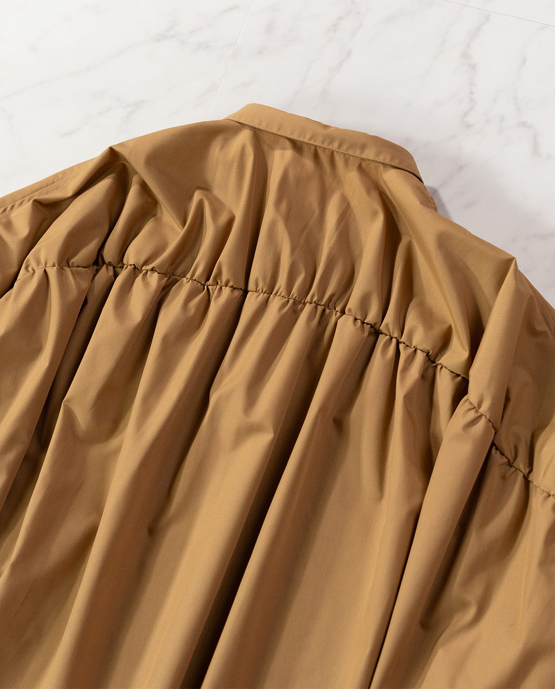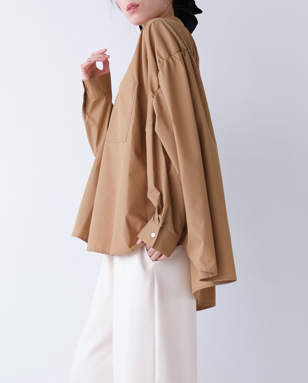 たっぷりとしたワイドめな身幅と、背中のギャザーがポイントのロングスリーブシャツ。
