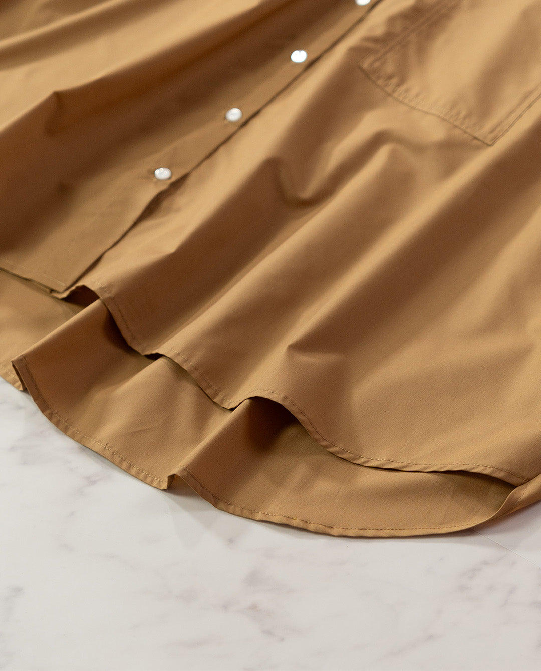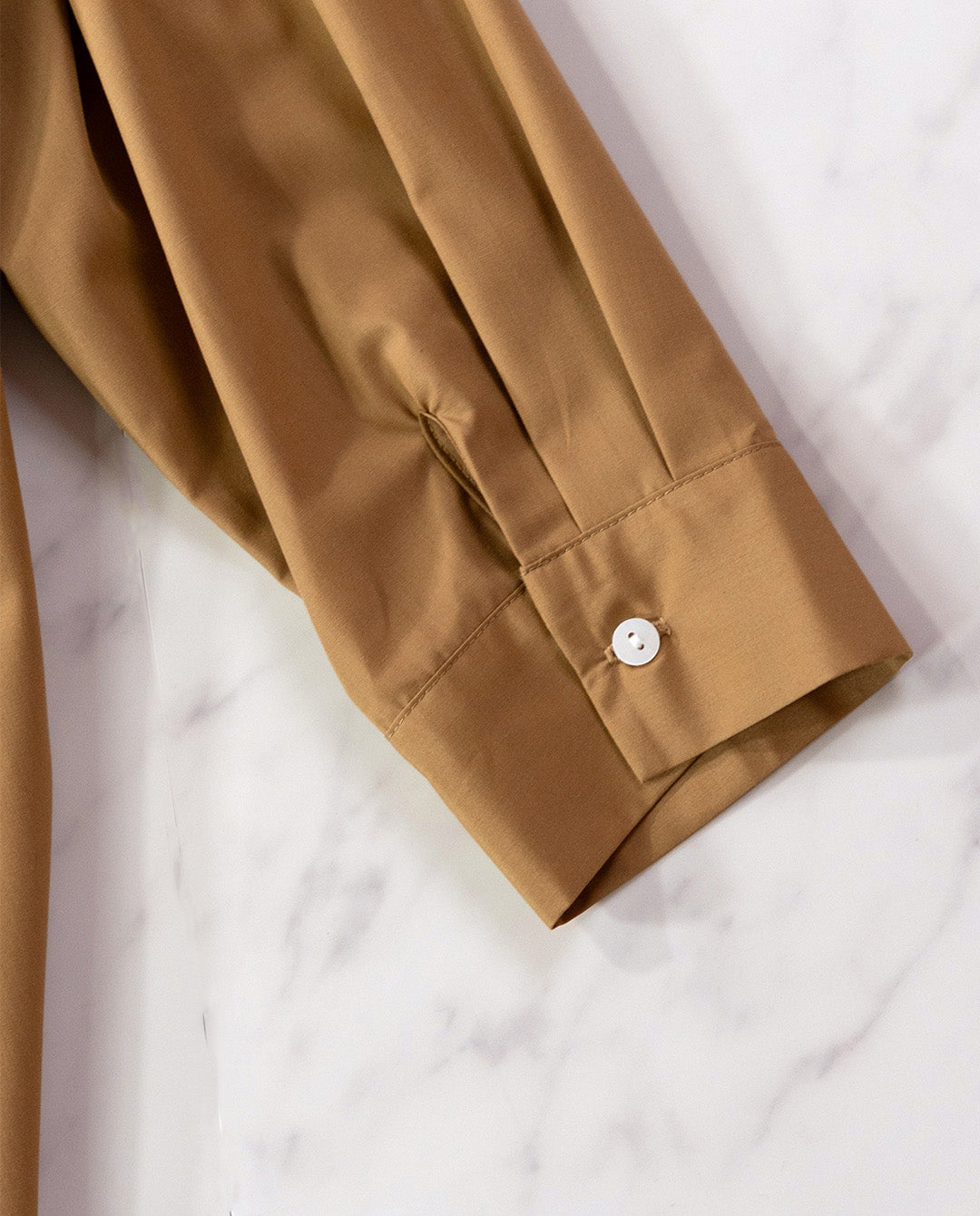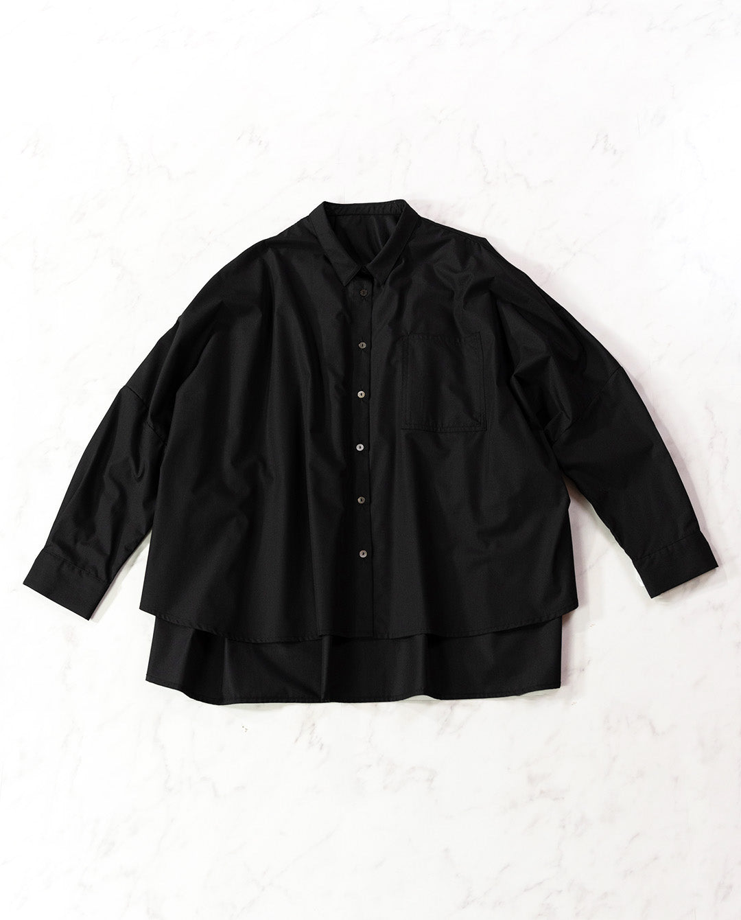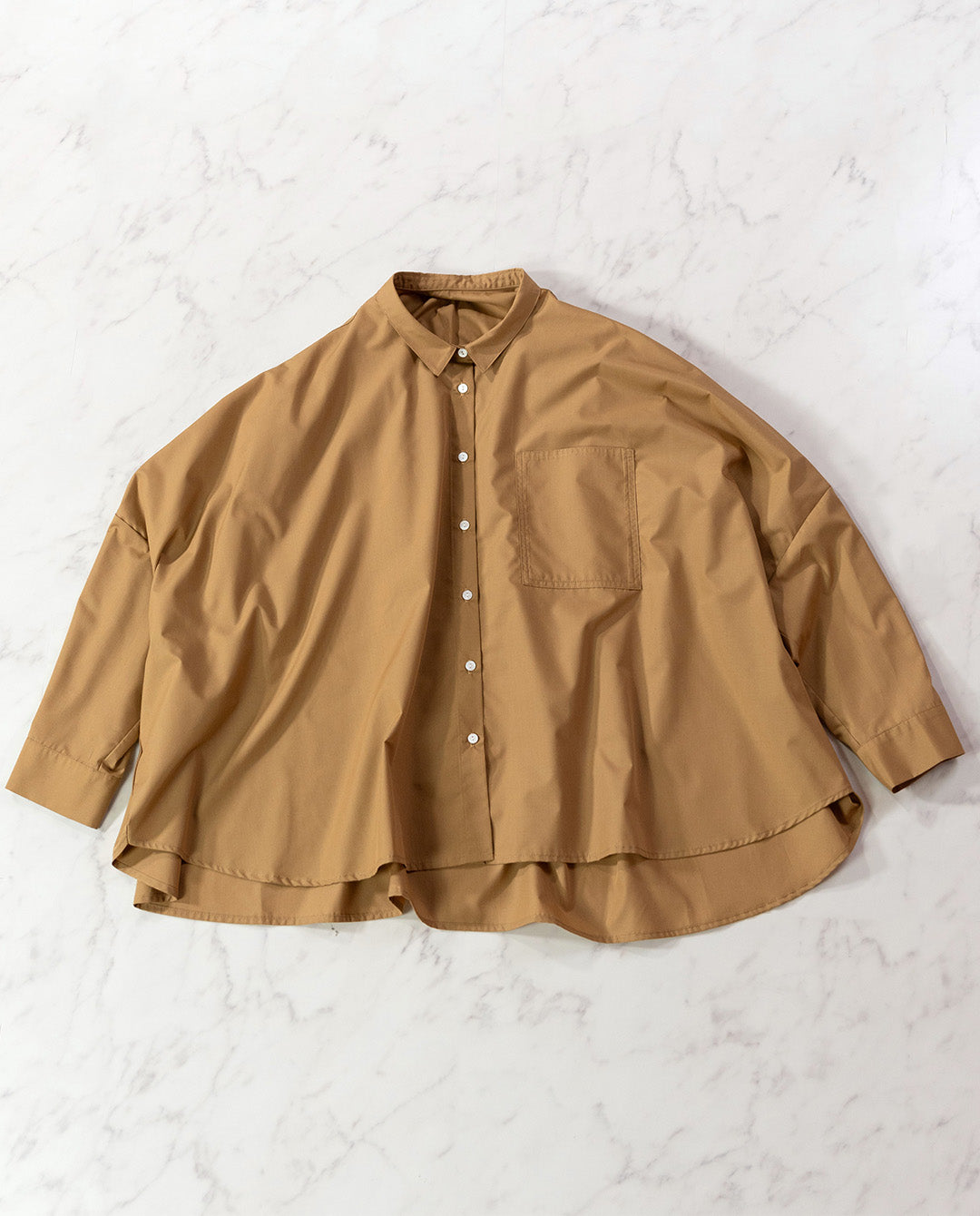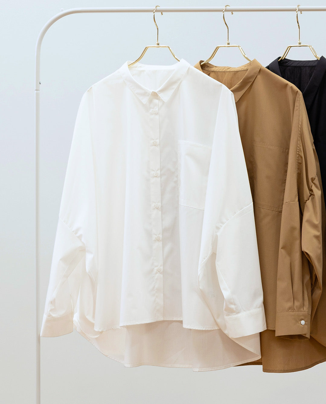 たっぷりとしたワイドめな身幅と、背中のギャザーがポイントのロングスリーブシャツ。